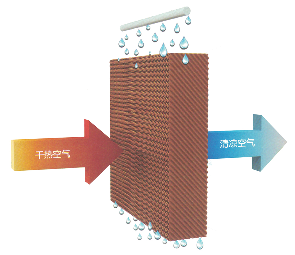 “科瑞萊”蒸發(fā)式冷氣機(jī)的核心降溫部件是“高效蒸發(fā)式濕簾”——純天然多層波紋植物纖維疊合物。根據(jù)“水蒸發(fā)吸收熱量,蒸發(fā)面積影響蒸發(fā)效率”這一自然物理現(xiàn)象,通過風(fēng)機(jī)往室內(nèi)送風(fēng),室外的新鮮空氣流經(jīng)浸水的濕簾后空氣與水份充分接觸同時(shí)吸收空氣中的顯熱,從而達(dá)到降溫、換氣、除塵、增加室內(nèi)空氣含氧量的目的,特別適用于高溫車間及人群密集的工作場所。