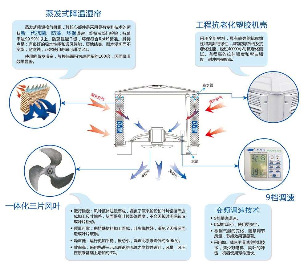 科瑞萊”蒸發(fā)式冷氣機(jī)結(jié)構(gòu)示意圖及特點(diǎn):